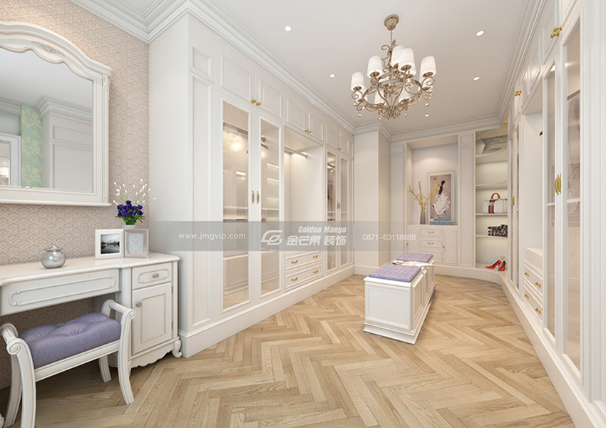 兩個衣帽間設計有異曲同工之處,以尊貴的紫色點綴。寬敞的衣帽間容納著主人對儀容儀表的態度。滿足主人的需求,呵護著主人的體驗。