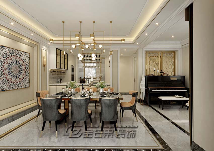 開放式的廚房,搭配上乳白色的柜體,更顯高貴、實用。設置有吧臺,存有很多珍藏的美酒,一飲而盡也是極致享受。餐廳的座椅則是巴洛克的體現,坐感更加舒適,琳瑯滿目的吊燈,帶著工業的風格。旁邊的鋼琴,成為演繹音符的最佳地方。