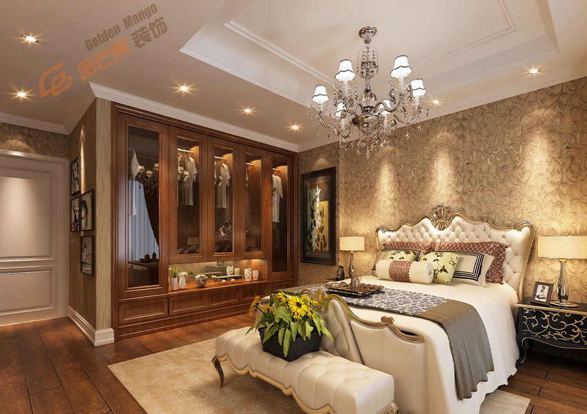 酒紅色木質地板,歷史的味道傾瀉而出,金色背景和燈光的渲染,高貴的氣息顯露無疑。凹凸有致的床頭顯得質感十足,酒紅色的柜體,洋氣大方,吊燈有著獨特的風味。此時,好像向日葵已成為基本的搭配。