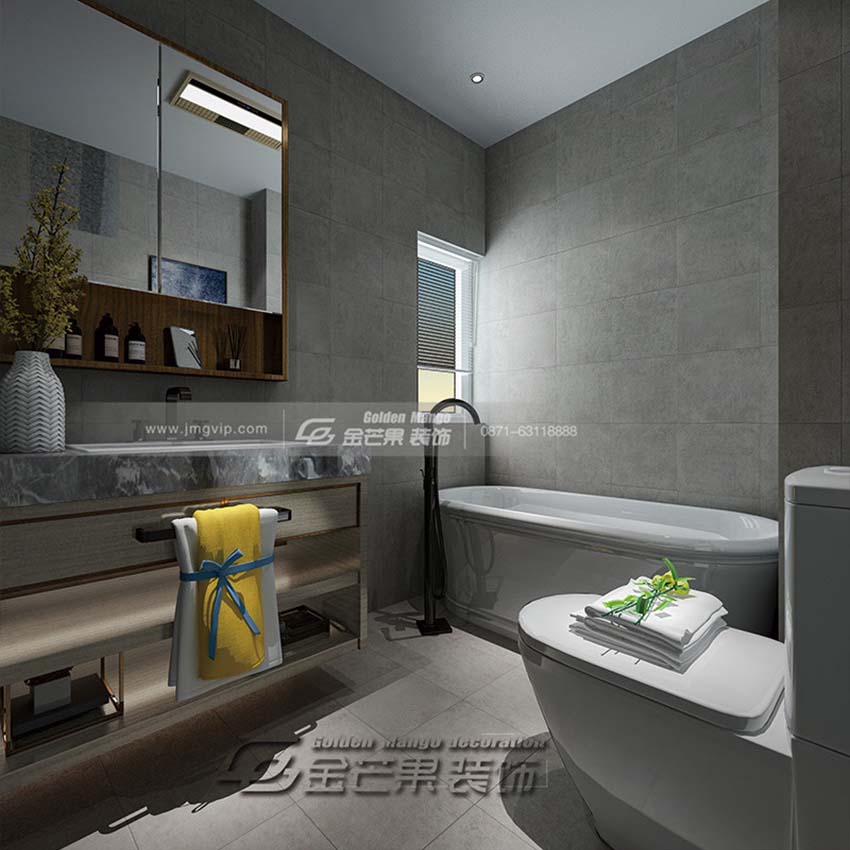 色調(diào)較為統(tǒng)一,以灰色的瓷磚搭配,浴缸的設(shè)置,讓疲倦的身體得以最大的滿足,在柜體下方布置燈帶顯得貼心十足,防止邊角對(duì)身體的磕碰。