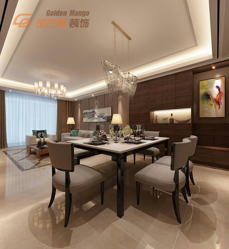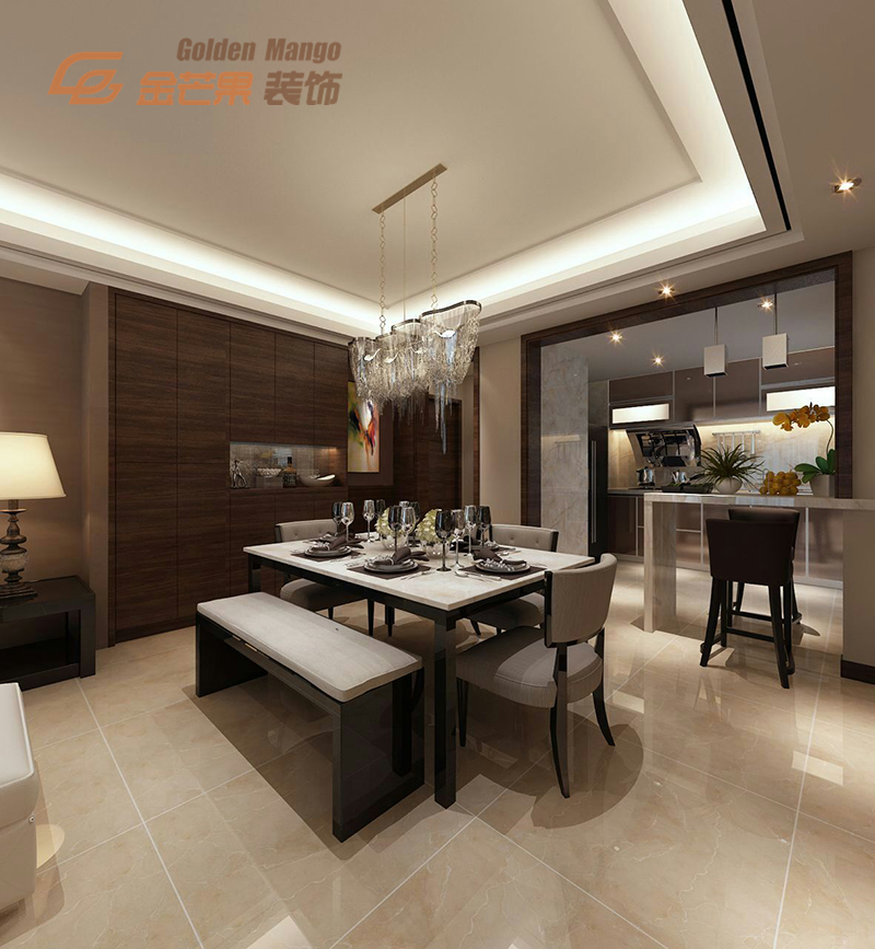 中式風(fēng)格的沙發(fā),咖啡色的背景墻。巨大的回字形燈帶為整體光照貢獻(xiàn)著力量,兩種風(fēng)格地磚相互搭配,中式風(fēng)格的茶幾。客廳和餐廳相互聯(lián)系,使用上有更好的便利性。透亮的吊燈,墻面以酒紅色的木質(zhì)板材拼接。