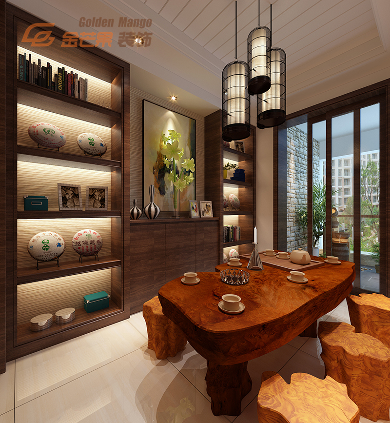 品茶區(qū)側(cè)重以中式風(fēng)格為主,精心布置的茶桌和凳子也能看出,業(yè)主是一個好客之人,注重自身的修養(yǎng)和品德。喜歡收藏茶葉,這是對茶友最好的饋贈,聊天的閑暇之余也能欣賞窗外的美景。此時更顯得清新優(yōu)雅。