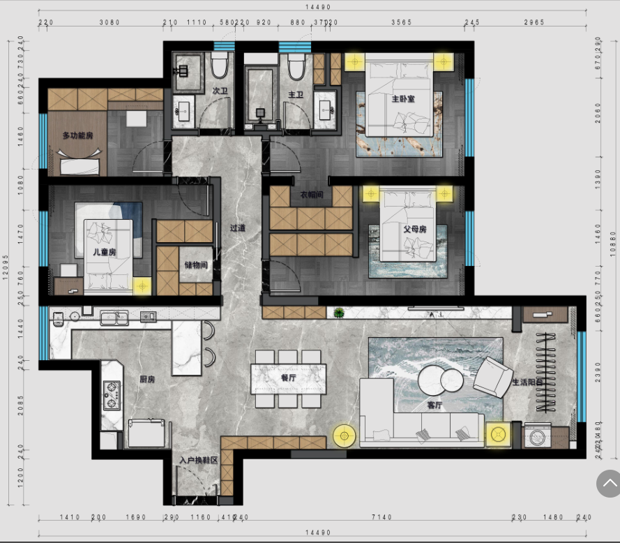 結合次臥大于主臥和業(yè)主儲存空間太小的需求,設計師在父母房、兒童房、多功能房都設置了大量的儲物空間,實用而減少空間浪費。