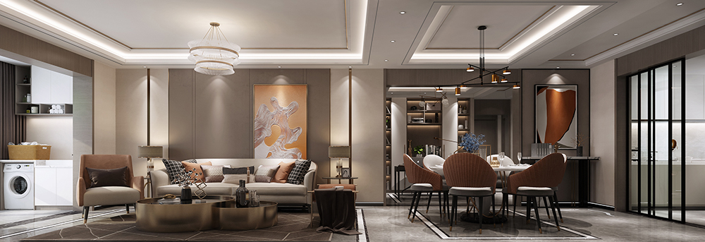 客廳沉靜優(yōu)雅的棕色,營造輕奢精致的格調。鐵藝家具充滿高級感。