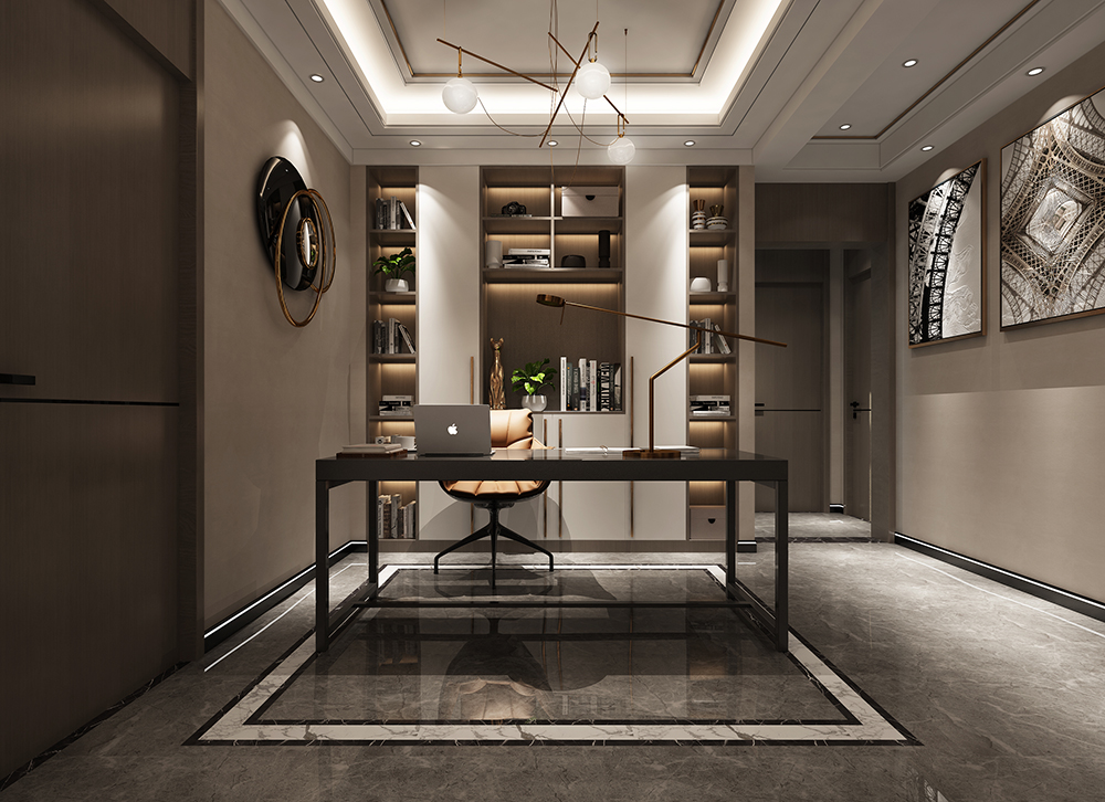 開放式書房滿足業(yè)主需求。白色柜體中和了暗色調,增加通透感,寫意裝飾畫增加藝術氣息。整體空間是 一個沉靜的、利于思考的氛圍。
