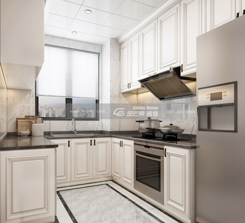 乳白色的柜體和黑色的操作面形成鮮明的對比,柜體強大的儲物空間也使廚房變得干凈美觀,U型布局的廚房也使烹飪變得高效方便。采光和通風較好,烤箱、冰箱等等一應俱全,隨用隨到。