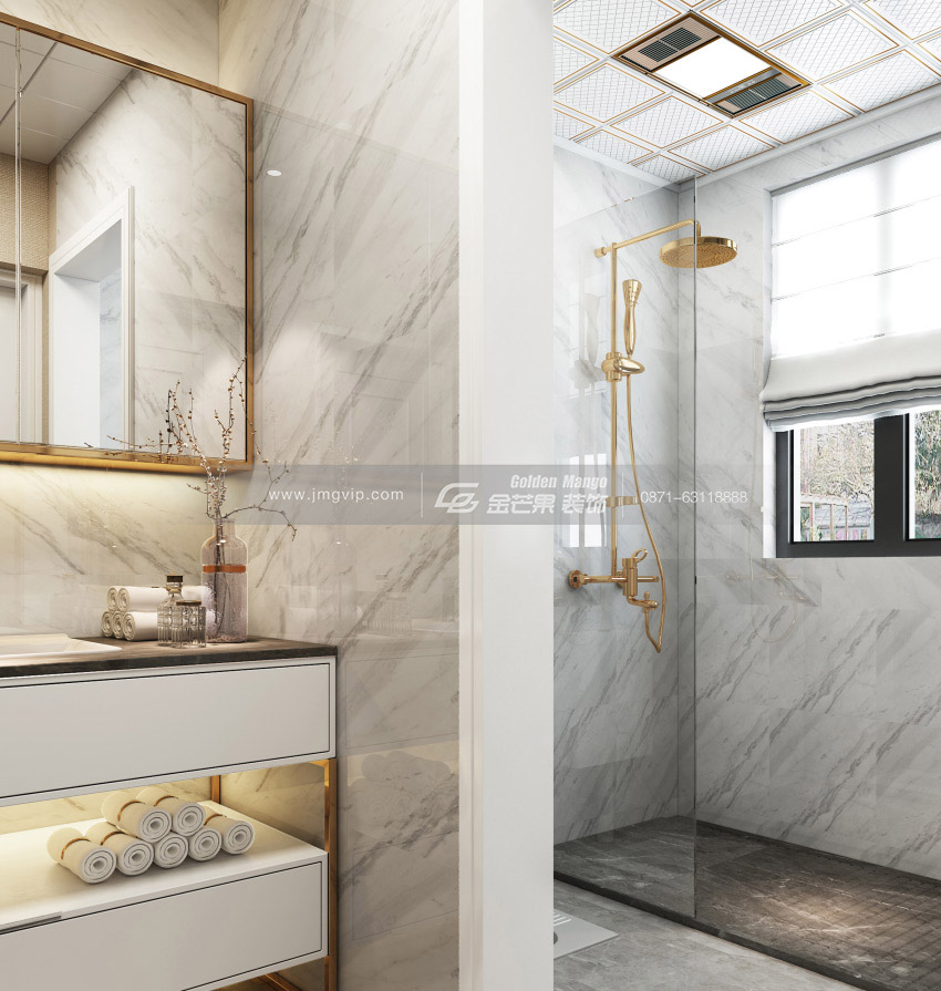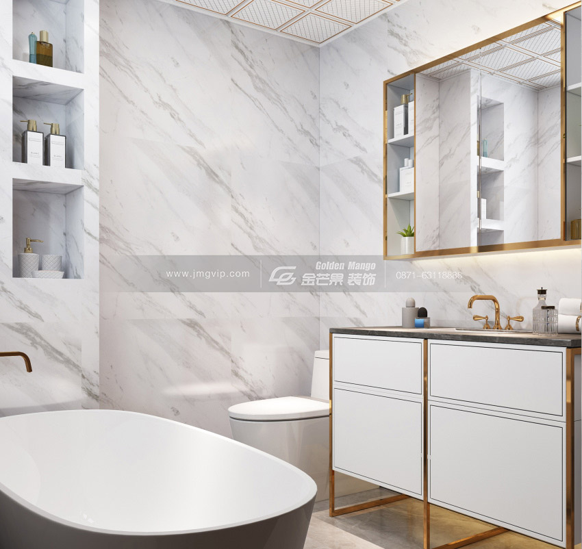 乳白色的瓷磚搭配上淺灰色顯得格外的淡雅,金色走邊的鏡子和臉盆則顯得奢華、高貴。潔白的浴缸是給疲倦身體最好的撫慰。