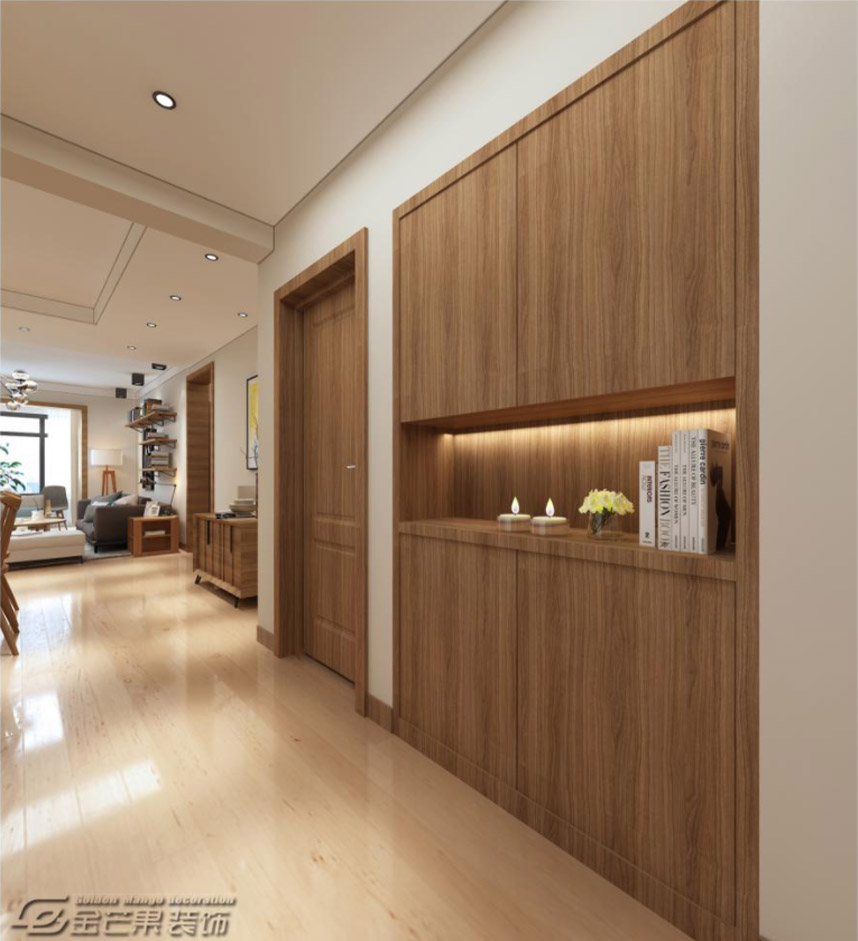 木材和墻面相互搭配,無論是門還是柜體大小都剛好合適。柜體深處搭配上燈帶,細節(jié)方面有更多的考慮。木質(zhì)的踢腳線和木質(zhì)的地板自然過渡,不顯突兀。