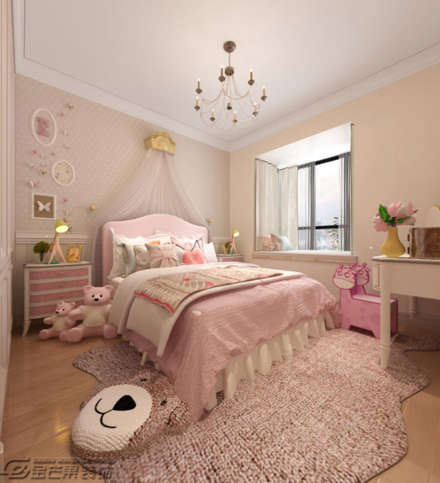 滿屋的嫩粉色承載著滿滿的少女心,溫暖的氣氛在地毯的作用下,表現(xiàn)更加明顯。蚊帳伴隨著美夢入眠。吊燈的設(shè)計襲成了浪漫的風(fēng)格。