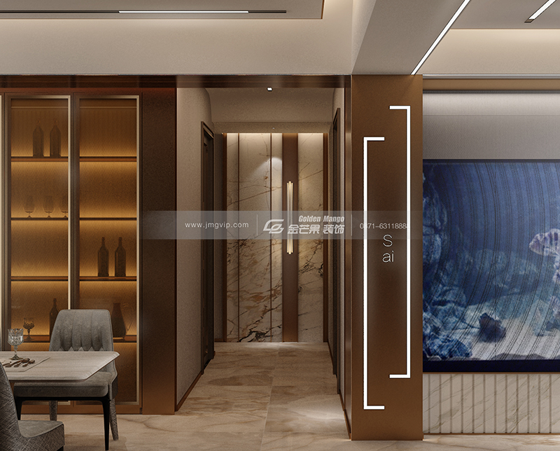 金屬質地的吧臺椅呼應整體空間,墻上的寫意裝飾畫簡而不減,奢而不膩。個性的酒柜設計,讓人忍不住將視線聚集在此,空間的豐富層次感在此得以呈現。