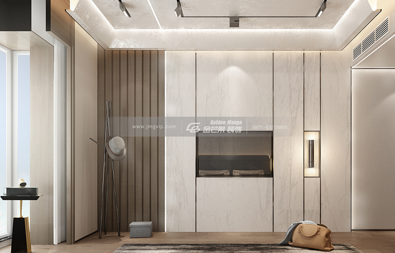 簡單,舒適,釋放身心的空間,區別于客餐廳棕色流金色調的營造,臥室以溫柔沉穩的白色調為主。銀色的線條精美氣質,營造輕奢感。純色的床具在光線照射下呈現如水般流動的絲滑感,奢華而不煩膩,貴氣而不張揚。簡潔的床頭背景墻一抹清新的藍色,成為了臥室中的亮點,溫潤彰顯,氣質有余。