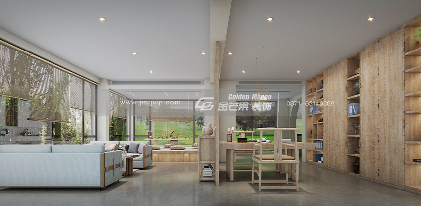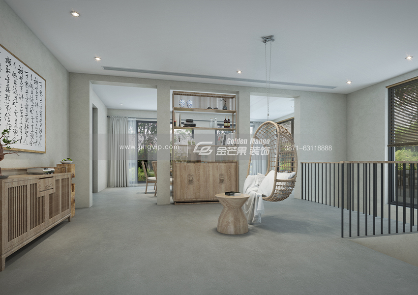 簡(jiǎn)單的配色搭配原木的吊頂和家具,整個(gè)空間營(yíng)造一種純粹、大氣、古樸的感覺(jué)。慵懶的沙發(fā)既舒適又時(shí)尚,簡(jiǎn)單的茶幾回歸自然,吊燈既充滿設(shè)計(jì)感又為空間增添了溫馨、精致的感覺(jué)。客廳整體空間營(yíng)造一種空靈、通透的感覺(jué),讓身心得以釋放,有讓人置身叢林之感。