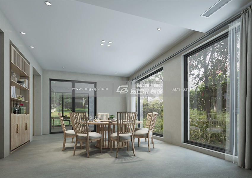 寬大的玻璃窗讓整個(gè)餐廳更精致了,搭配原木的餐座椅和櫥柜,既符合房間整體的格調(diào),又具有自然、精致之美。