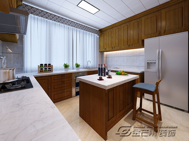 木材的櫥柜和石材的操作臺,穩重不失時尚。寬闊的操作臺和冰箱非常實用,干凈簡潔。