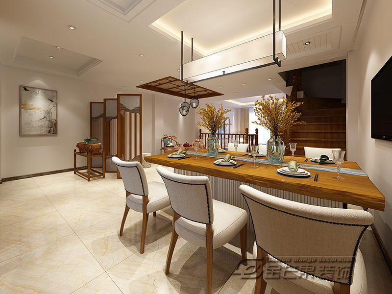 這里再一次實現了中西碰撞,西式的餐吧椅、吊燈、酒柜,搭配中式的選材和瓷器等擺件,非常具有特色。