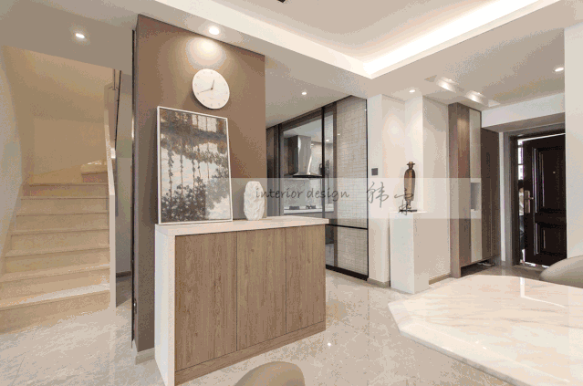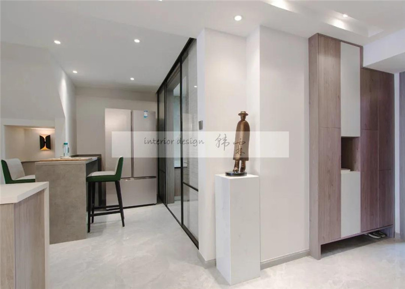 入戶轉(zhuǎn)角處摒棄常規(guī)的平轉(zhuǎn)角,設(shè)置了動線轉(zhuǎn)角,在進(jìn)出門之間形成空間對話。