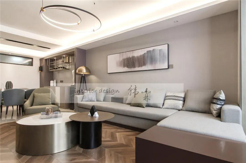 沙發(fā)的選用延續(xù)整體的優(yōu)雅色調(diào),金屬質(zhì)感主茶幾和邊幾,造型簡約,搭配簡約風(fēng)的燈飾,蘊(yùn)含低調(diào)的奢華。