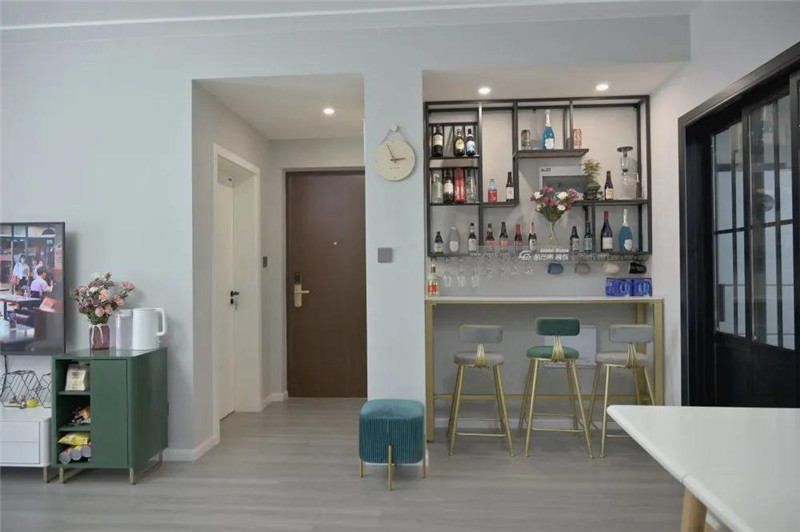 黑色三移門,和吧臺呼應,又中和了整個淺色系的空間,三扇門重合起來,空間會更顯開闊。