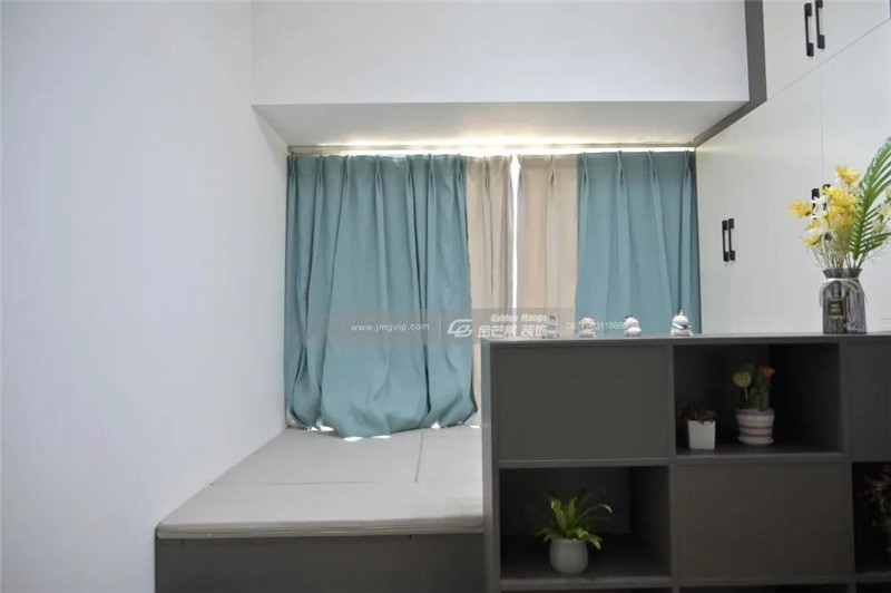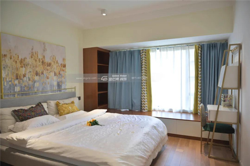 床頭設計吊柜,增加收納空間。旁邊的柜體,既可以收納東西,又可以作為桌子來使用,同時可以起到隔斷的作用,這樣的設計讓房間不管是在實用性還是溫馨感上都增加了不少。