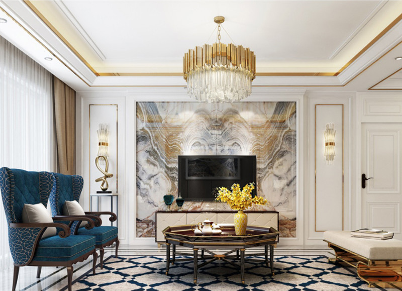 整體以淺色為主,深色為輔。藏藍色的座椅高貴、優雅,和鐵藝的家具搭配相得益彰。地毯和座椅搭配的恰到好處,營造雍容華貴的感覺。電視背景墻豐富空間層次,水晶吊燈增加奢華感。