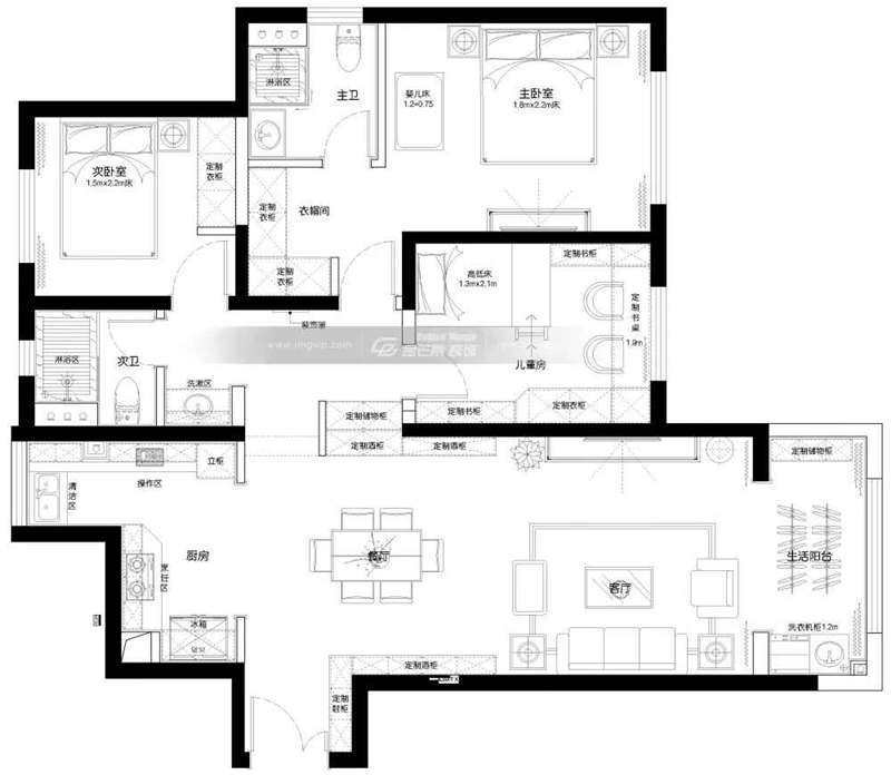 缺點(diǎn):廚房和生活陽臺空間過小;入戶即過道,且過道空間浪費(fèi)過大。