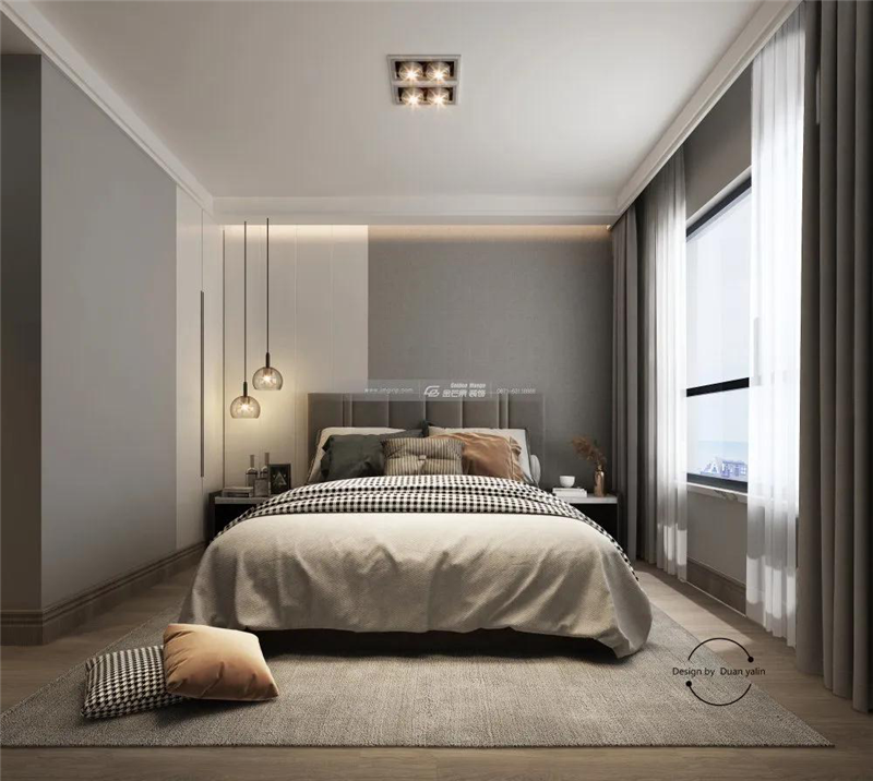 簡約不是簡單,而是一種復雜的考慮與設計;主臥的設計以灰白色為主要色調,墻面嵌入的柜子與背景墻融為一體用兩種顏色的拼接設計,在簡單大方實用的同時又凸顯高級與質感,吊頂的燈與床頭的吊燈更加凸顯出臥室的層次感,所呈現的是剔除一切繁瑣的設計元素,體現空間的個性和寧靜。