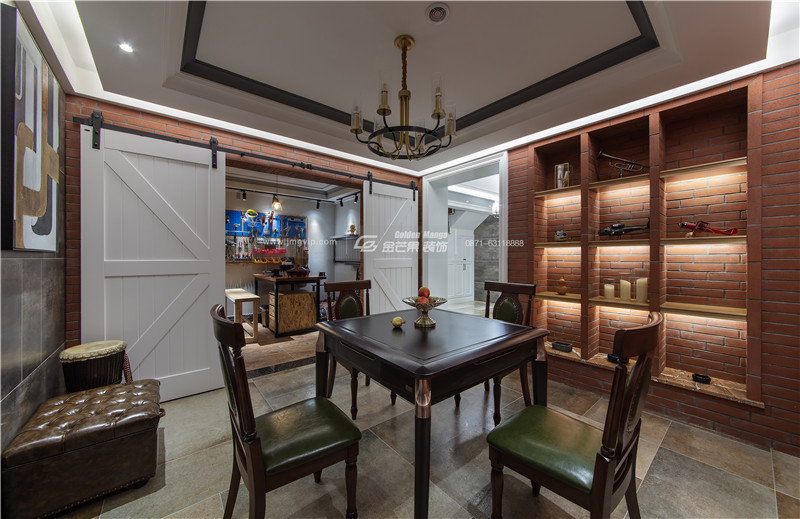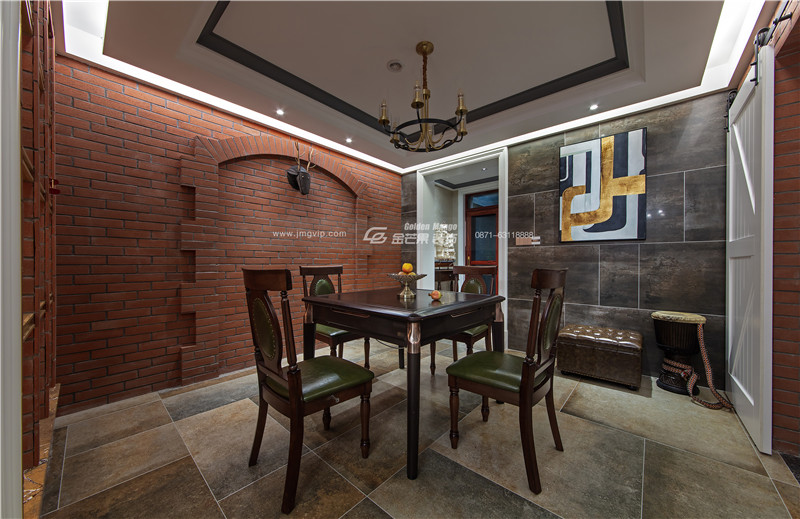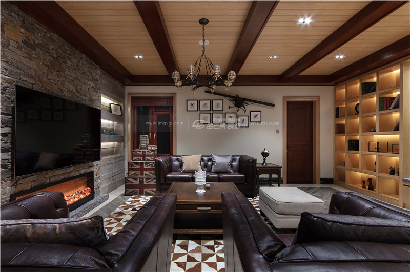 休閑客廳是比較隨性的格調,但與之于整個空間是協調的。柔軟的皮革,簡潔的家具,仿原始建材的背景墻,壁櫥,營造一種慵懶的氛圍,滿足業主平時一些放松、休閑的需求。