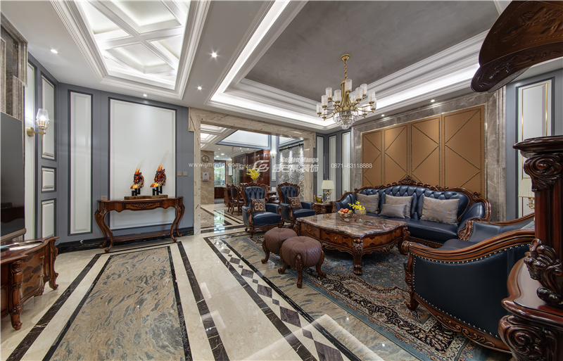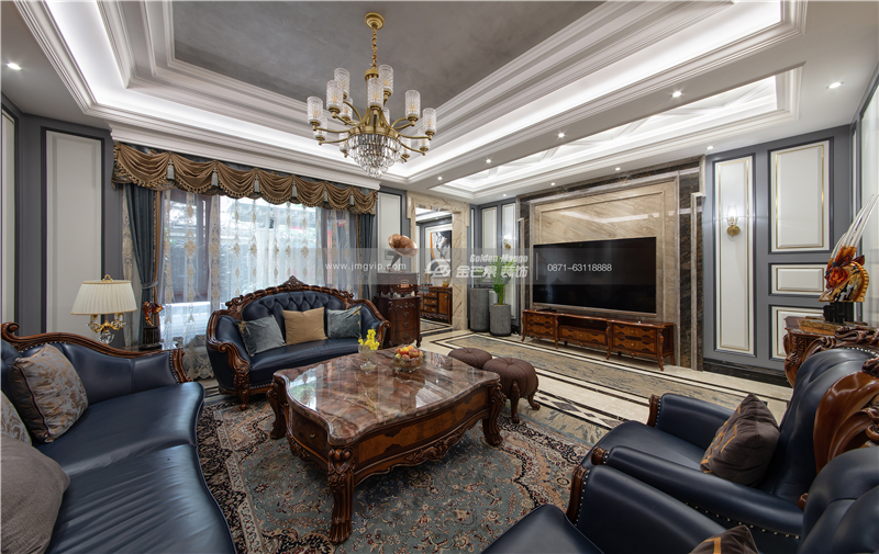 雕花燈槽彰顯低調的華麗,增添幾分奢華的味道。墨藍色沙發格調盡顯,運用貫穿其中的皮革元素,搭配古樸、復古的造型,營造宮廷皇室般的感覺。西方復古元素的地毯,更顯貴氣。