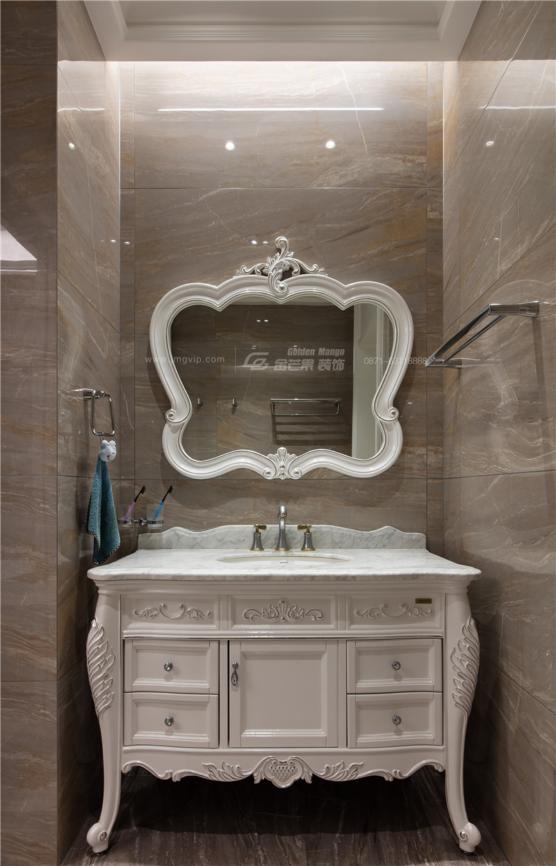 白色家具既典雅,又容易營造大氣、高潔的感覺,運用白色柜體和臺盆,加上雕花的設計,讓入浴晉升為一種奢華的享受。