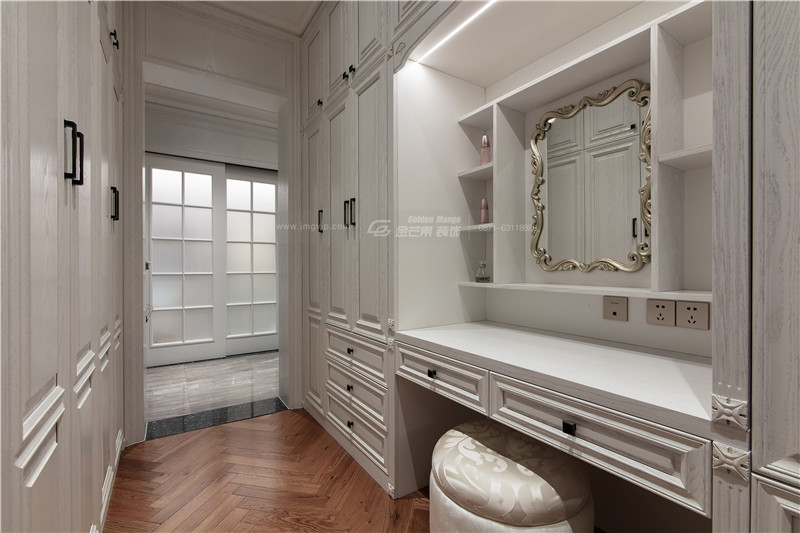 寬闊的空間加上大面積的白色,浪漫、高潔的臥室歲月構想在此流動成一段唯美的樂章。如夢似幻,燈飾的流蘇設計仙氣飄飄,無論是吊頂的銀色雕花還是墻上的雕花暗紋,無一不透露出細節的搭配。