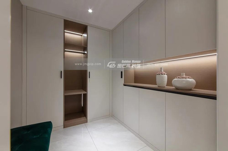 一進門,地磚鋪花的儀式感延伸到室內,簡單、純凈的象牙白色調讓高級的生活更出色。入戶左手邊的儲物柜使進出之間更加便利簡潔,右手邊畫飾和地磚花紋打造空間呼應感。