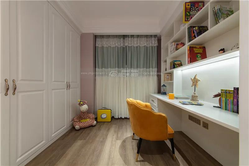 明亮的窗戶和雅致的窗簾,為空間注入蓬勃的朝氣,整體優雅的基調加上清新的藍色,讓閱讀思考空間變得靈動。