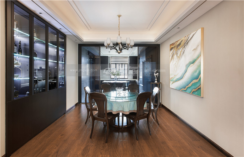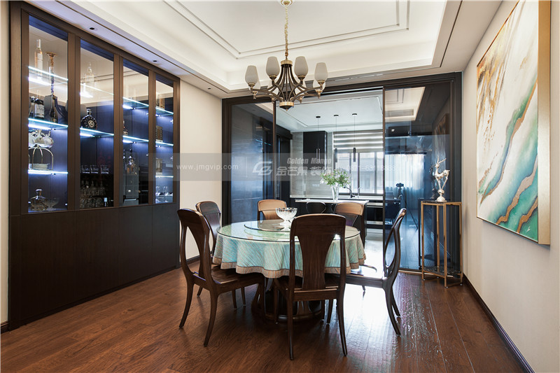 金色的掛畫和西式的酒柜隔空而望,精致和端雅的碰撞,一中一西,家居也是如此多變。