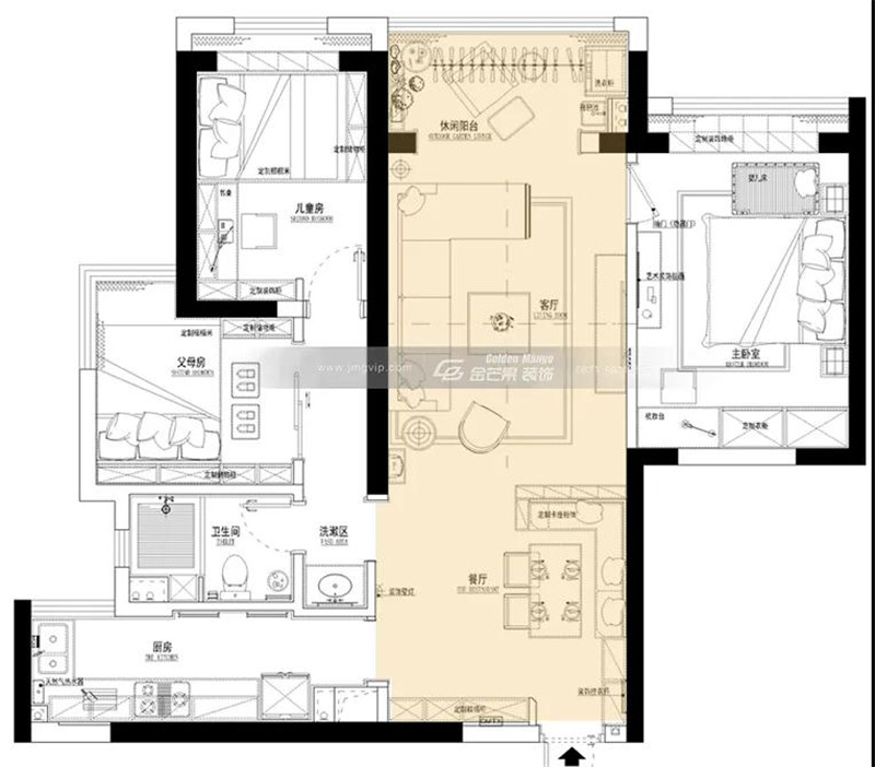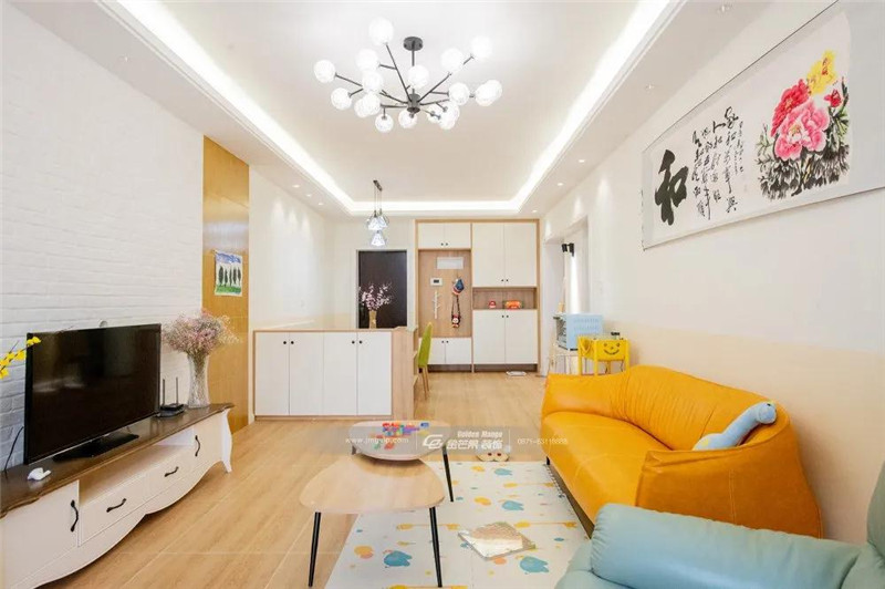 全屋以黃色為基調(diào),明媚的黃色總是能帶給人溫暖、溫馨的感覺,意在為業(yè)主一家打造其樂融融的家居氛圍。