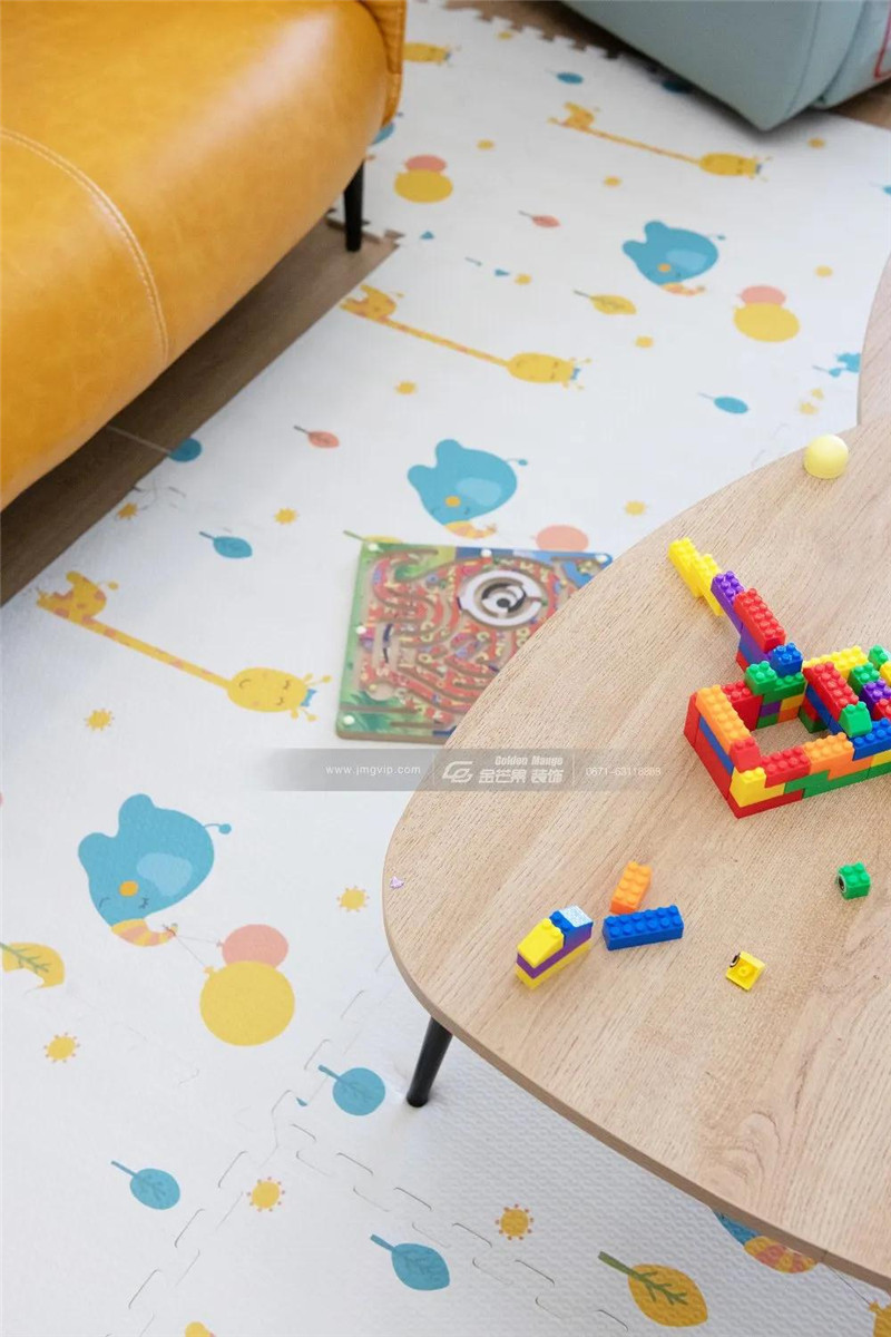 客廳選用的是很簡(jiǎn)單的小茶幾,輕易就可以搬開,為孩子騰出一塊自由活動(dòng)的天地。不管是畫畫、還是搭積木,都是很好的親子互動(dòng)的空間。可愛的卡通地毯,滿足孩子的童真,也讓父母可以像孩子的朋友般,和孩子更親昵。