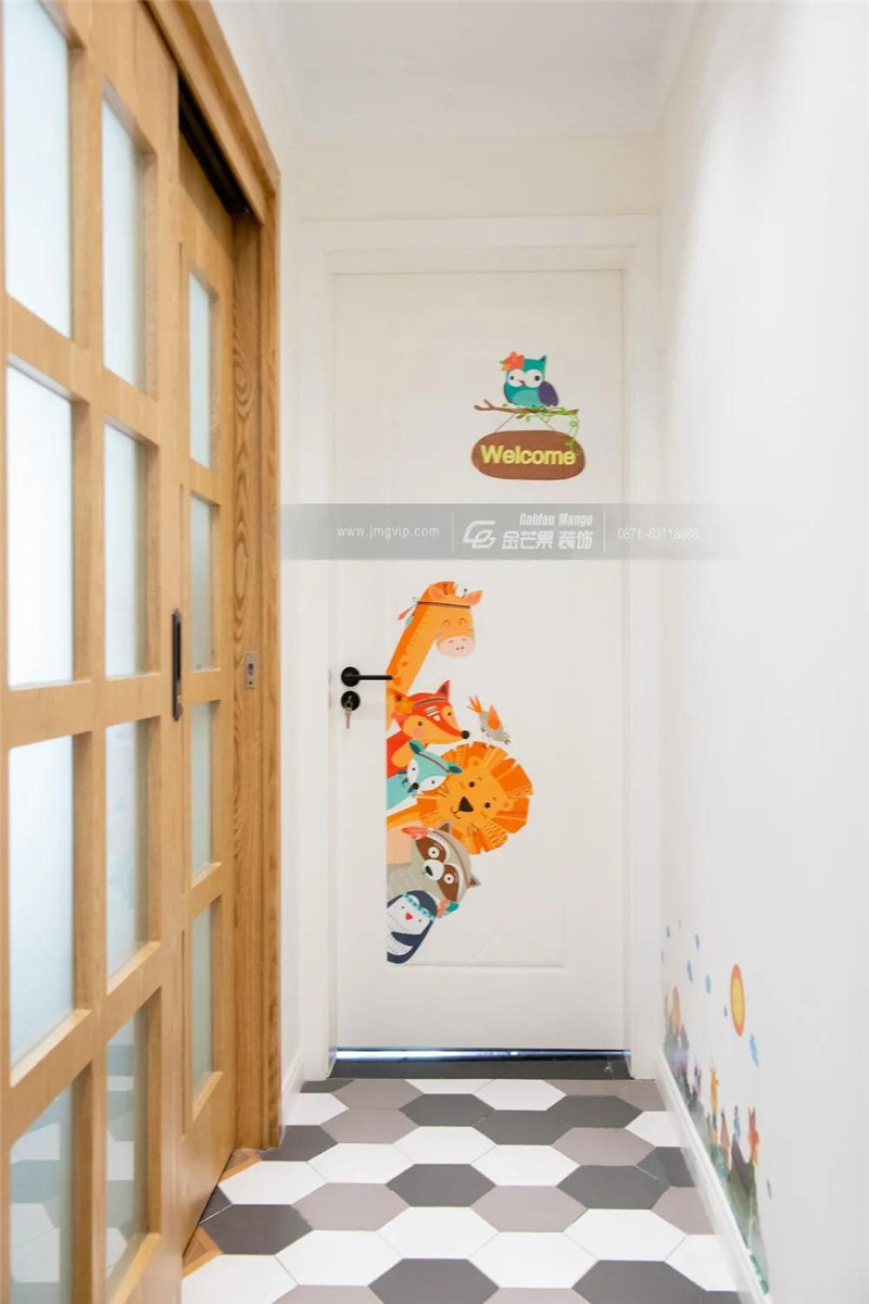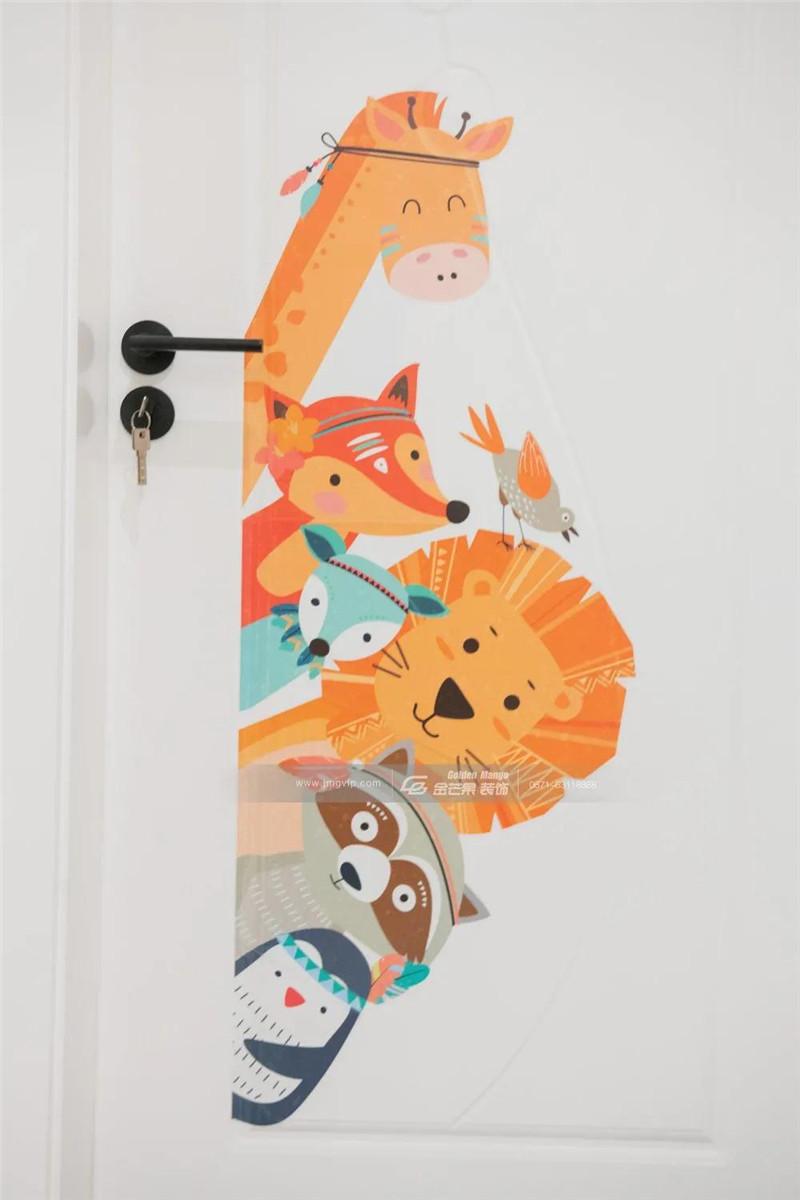 在門上和過道上繪制可愛的卡通圖案、貼紙,留言涂鴉墻不浪費(fèi)過道空間,增加趣味性。