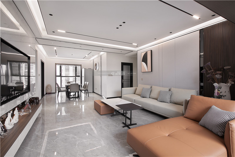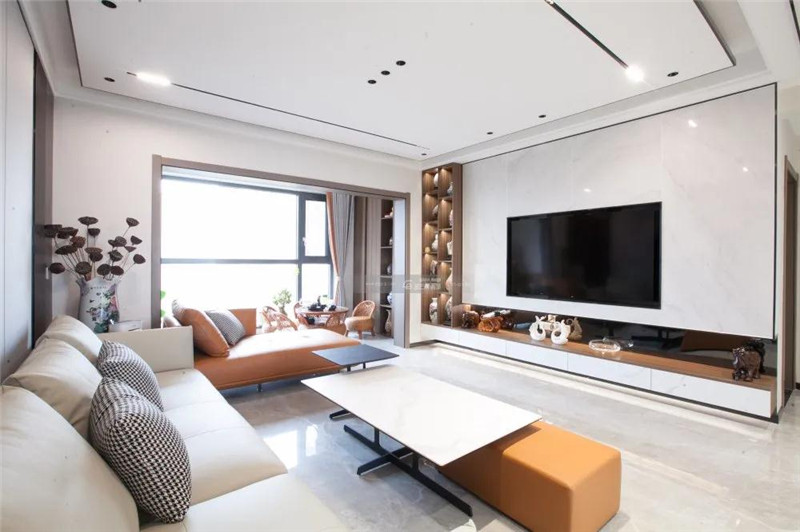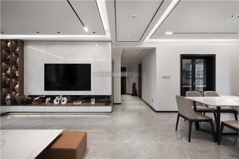 大理石電視背景墻,黑色線條點綴,整體感很強。木質柜體的溫度讓疲憊的夜歸人得以安撫,溫暖的光線下,是心底那一束尋求溫馨的光。