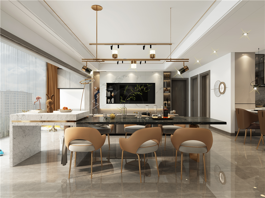 金色餐桌椅搭配黑白石材桌子,用細(xì)節(jié)點綴出精致的家居氛圍,石材和金屬線條、材質(zhì)碰撞出的高級感,更添儀式感和精致的感覺。