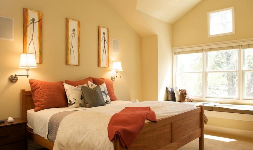 臥室光線以柔和、暖色調(diào)為主。可用壁燈、落地?zé)魜?lái)代替室內(nèi)中央的頂燈,壁燈宜用表面亮度低的漫射材料燈罩,床頭上方的墻壁,裝一盞茶色刻花玻璃壁燈,具有古樸、典雅、深沉的韻味。床頭柜上可用子母臺(tái)燈,如果是雙人床,還可在床的兩側(cè)各安一盞配上調(diào)光開(kāi)關(guān)的燈具,以便其中一人看書(shū)報(bào)時(shí)另一人不受光的干擾。